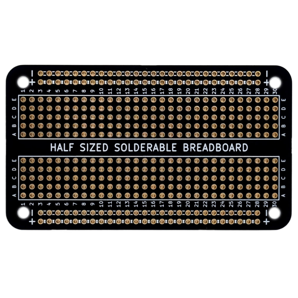 The Half-Sized Solderable Breadboard offers the same functionality and layout as a standard half-size 400-point breadboard, ideal for compact prototypes or smaller circuits. It lets you permanently solder your designs while keeping full compatibility with standard breadboard layouts.