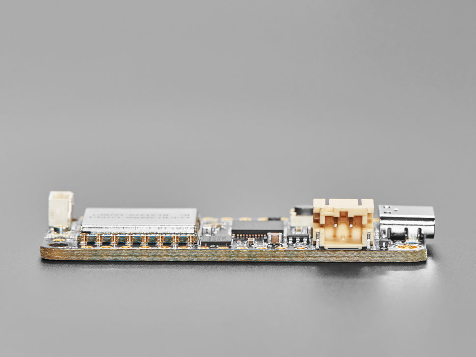We squished all the parts on our Feather RP2040 over towards the USB port to make some room on the end. This Feather RP2040 LoRa Radio uses the extra space left over to add an RFM9x LoRa 868/915 MHz radio module. These radios are not good for transmitting audio or video, but they do work quite well for small data packet transmission when you need more range than 2.4 GHz (BT, BLE, WiFi, ZigBee).